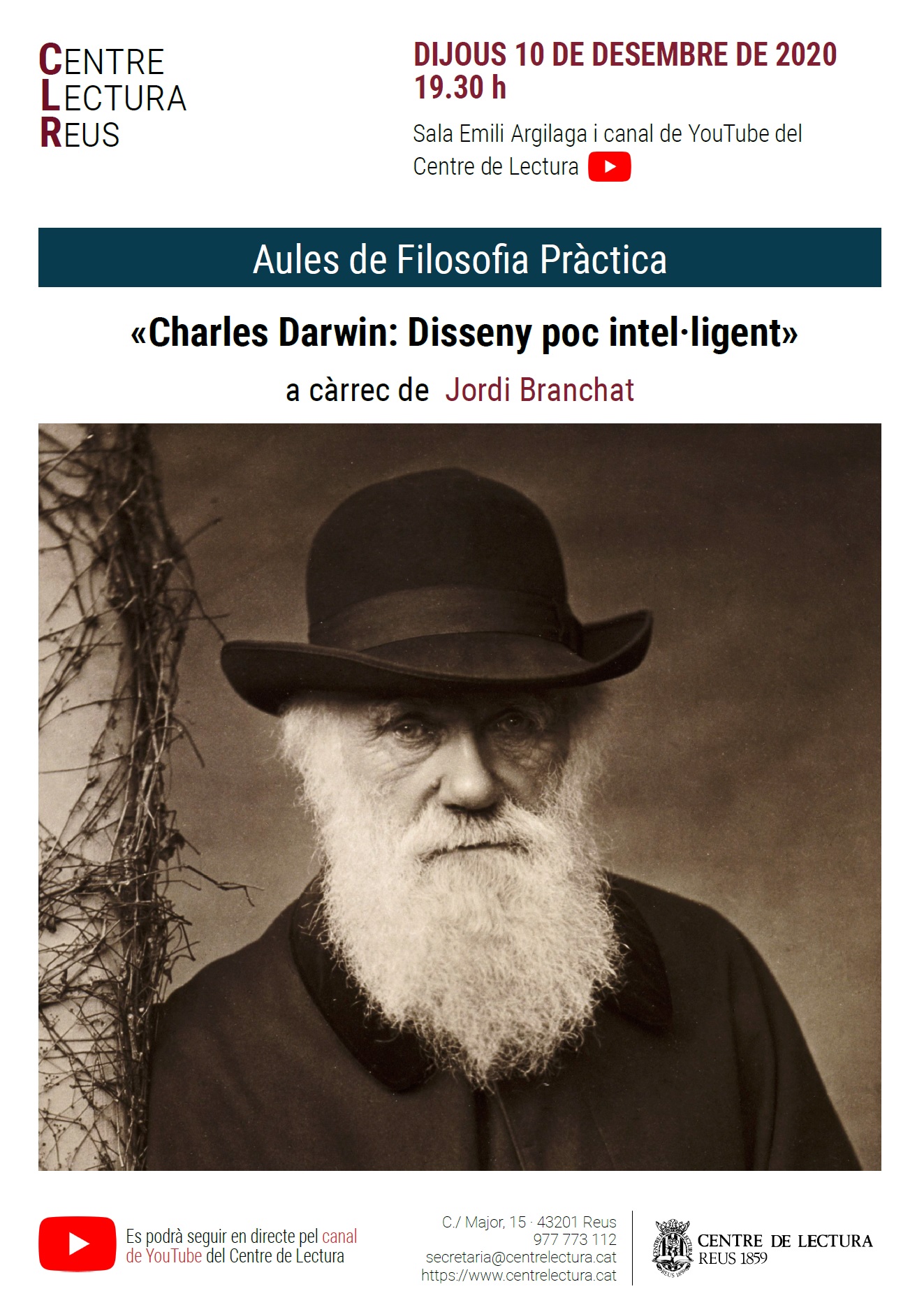 Dijous 10 de desembre, a les 19.30, a la sala Emili Argilaga i a la sala virtual, sessió de les Aules de Filosofia Pràctica, conduïda per Jordi Branchat: «Charles Darwin: disseny poc intel·ligent».