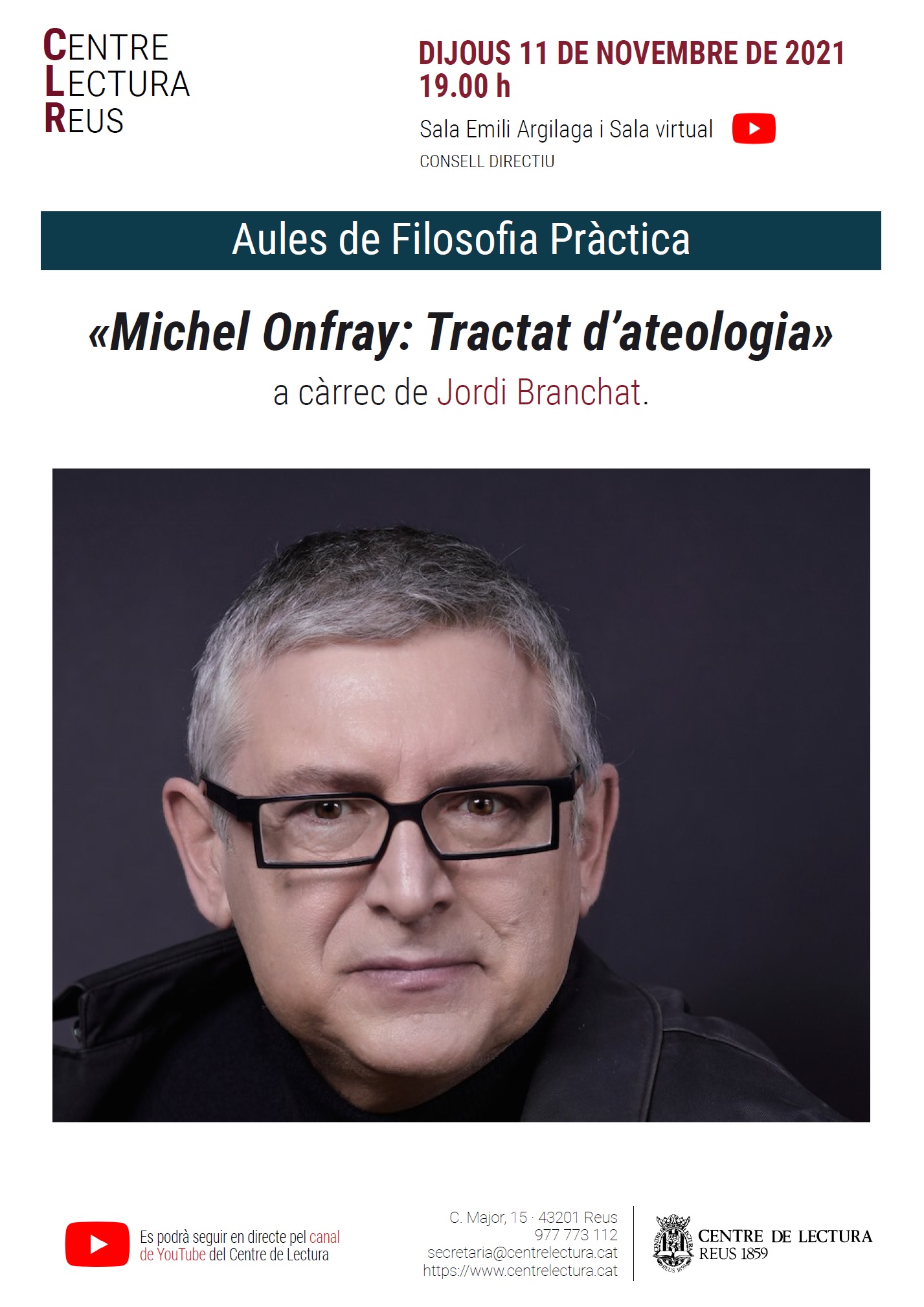 Dijous 11 de novembre, a les 19.00, a les sales Emili Argilaga i virtual, sessió de les Aules de Filosofia Pràctica: «Michel Onfray: Tractat d’ateologia», a càrrec de Jordi Branchat.