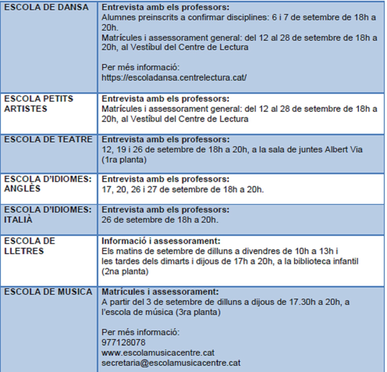 Calendari d’assessorament i matriculació de les escoles del Centre de Lectura del curs 2018/2019: Dansa, Petits Artistes, Teatre, Idiomes (anglès i italià*), Lletres i Música.