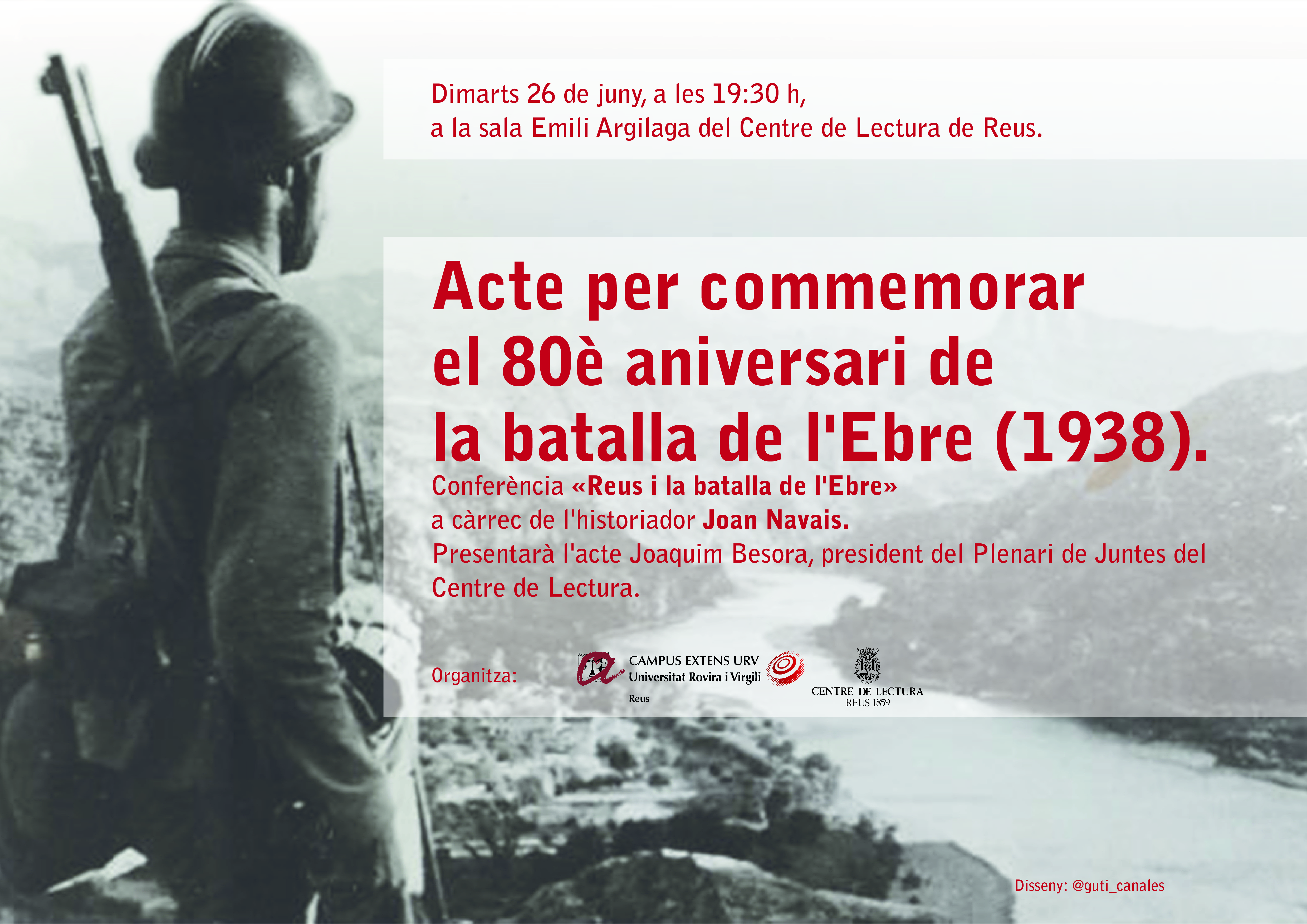 Dimarts 26 de juny, a les 19.30 h, a la sala Emili Argilaga, conferència «Reus i la batalla de l’Ebre», a càrrec de l’historiador Joan Navais. Acte per commemorar el 80è aniversari de la batalla de l’Ebre (1938). Presentarà l’acte Joaquim Besora, president del Plenari de Juntes del Centre de Lectura. L’activitat forma part del programa del Campus Extens de la URV a Reus.