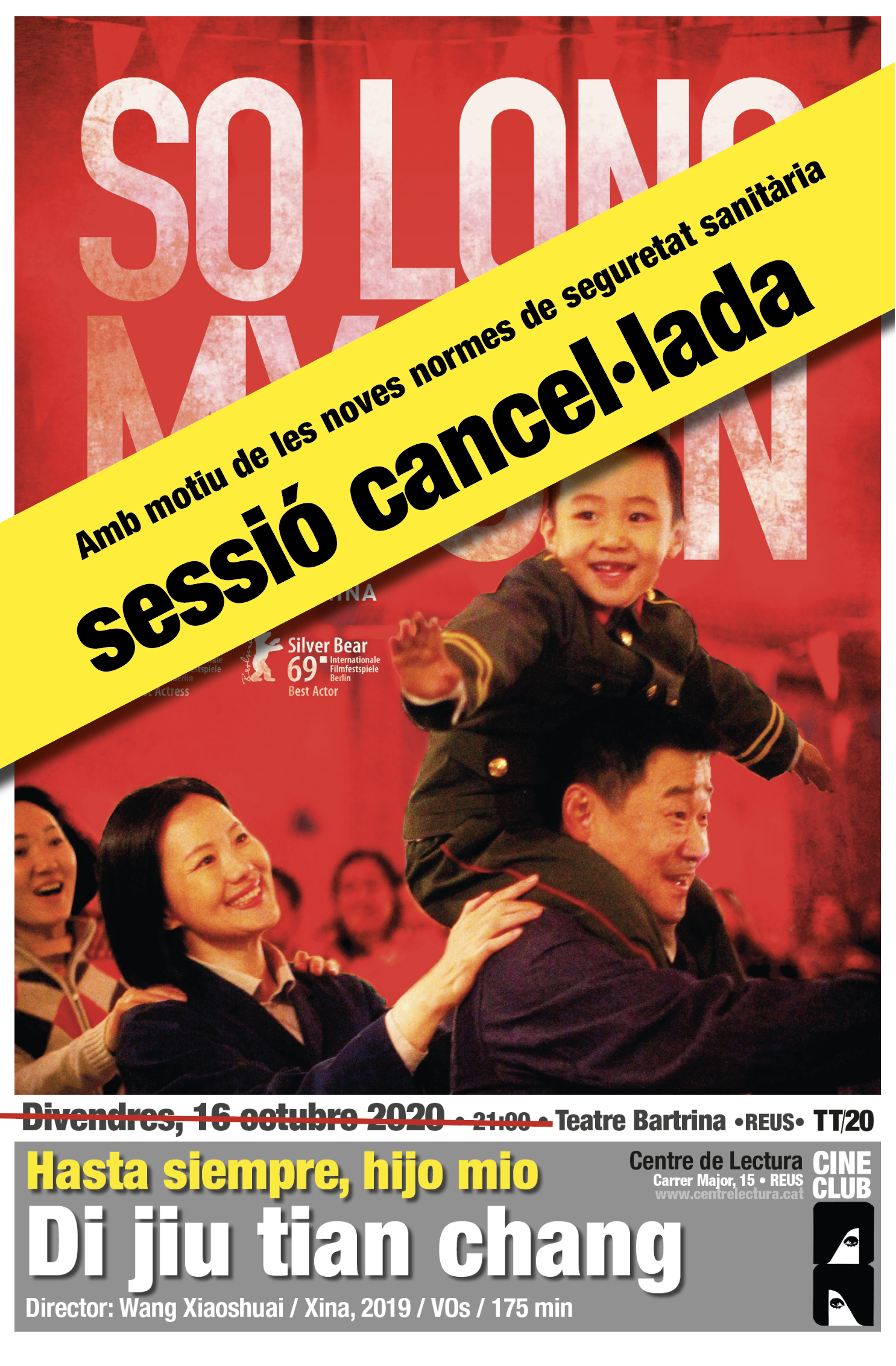 A causa de la llarga durada de la pel·lícula, el Cineclub del Centre de Lectura cancel·la la sessió de demà divendres, 16 d’octubre, en què s’havia de projectar al Teatre Bartrina la pel·lícula Di jiu tian Chang (Fins sempre, fill meu), de Wang Xiaoshuai. Recordem que les noves mesures de seguretat per la pandèmia de la covid-19 obliguen a tancar els teatres a les 23.00.