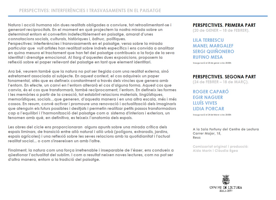 Primera part: inauguració el 20 de gener a les 20 h. Amb Lila Terbescu, Manel Margalef, Sergi Quiñonero i Rufino Mesa.