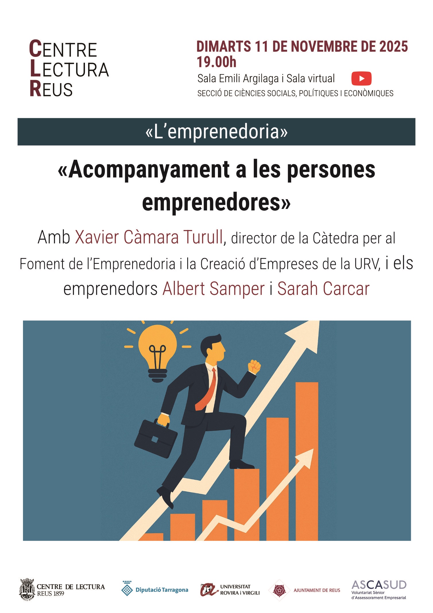 Dimarts 11 de novembre, a les 19.00, a les sales Emili Argilaga i virtual, cicle «L’emprenedoria»: sessió «Acompanyament a les persones emprenedores», amb Xavier Càmara Turull, director de la Càtedra per al foment de l’emprenedoria i la creació d’empreses de la URV, i els emprenedors Albert Samper i Sarah Carcar.