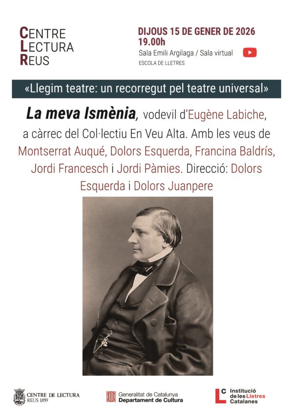 Dijous 15 de gener, a les 19.00, a les sales Emili Argilaga i virtual, cicle «Llegim teatre: un recorregut pel teatre universal»: lectura de La meva Ismènia, vodevil d’Eugène Labiche. Amb les veus de Montserrat Auqué, Dolors Esquerda, Francina Baldrís, Jordi Francesch i Jordi Pàmies. Direcció: Dolors Esquerda i Dolors Juanpere.