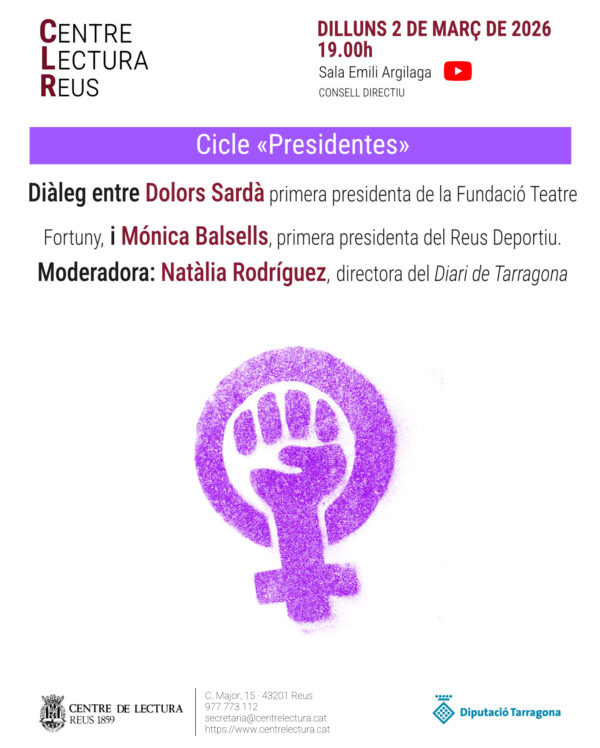 Dilluns 2 de març, a les 19.00, a les sales Emili Argilaga i virtual, cicle «Presidentes»: diàleg entre Dolors Sardà, primera presidenta de la Fundació Teatre Fortuny, i Mónica Balsells, primera presidenta del Reus Deportiu. Moderadora: Natàlia Rodríguez, directora del Diari de Tarragona.