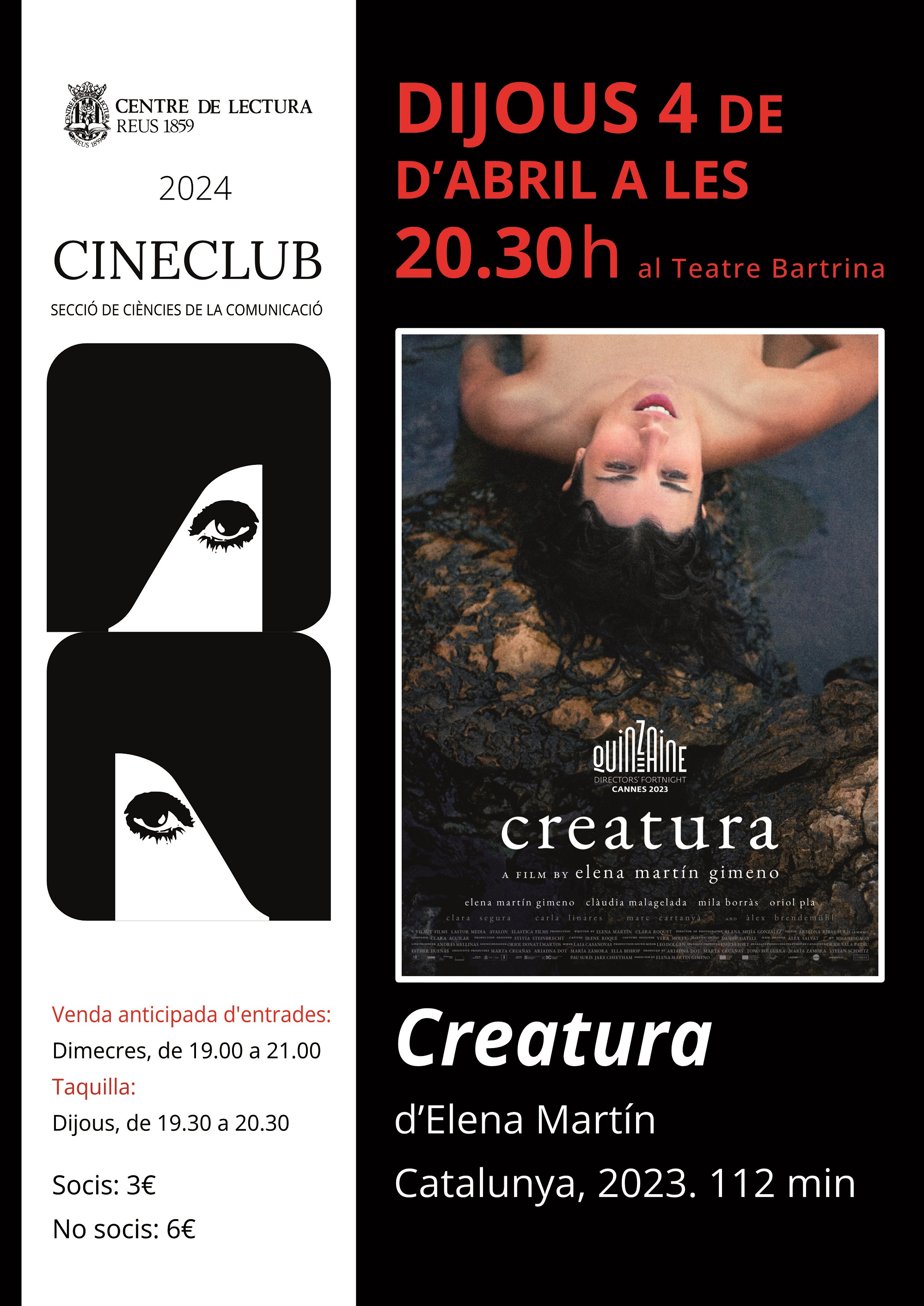 Dijous 4 d’abril, a les 20.30, al Teatre Bartrina, Cineclub: projecció de la pel·lícula Creatura, d’Elena Martín. Catalunya, 2023. 112 min.