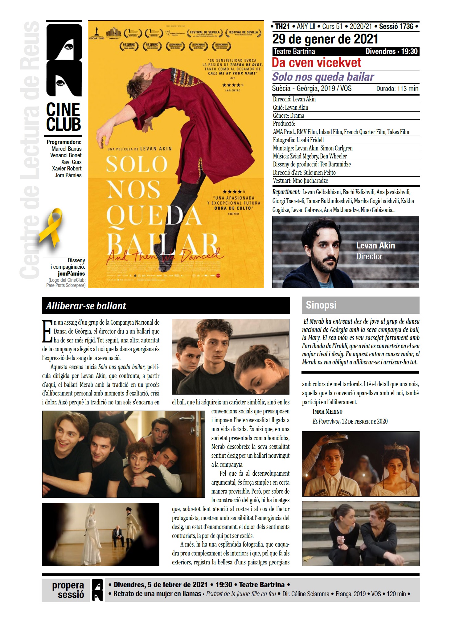 Divendres 29 de gener, a les 19.30, al Teatre Bartrina, Cineclub: Da cven vicekvet (And Then We Danced – Només ens queda ballar), de Levan Akin. Suècia-Geòrgia, 2019. Vos. 113 min.