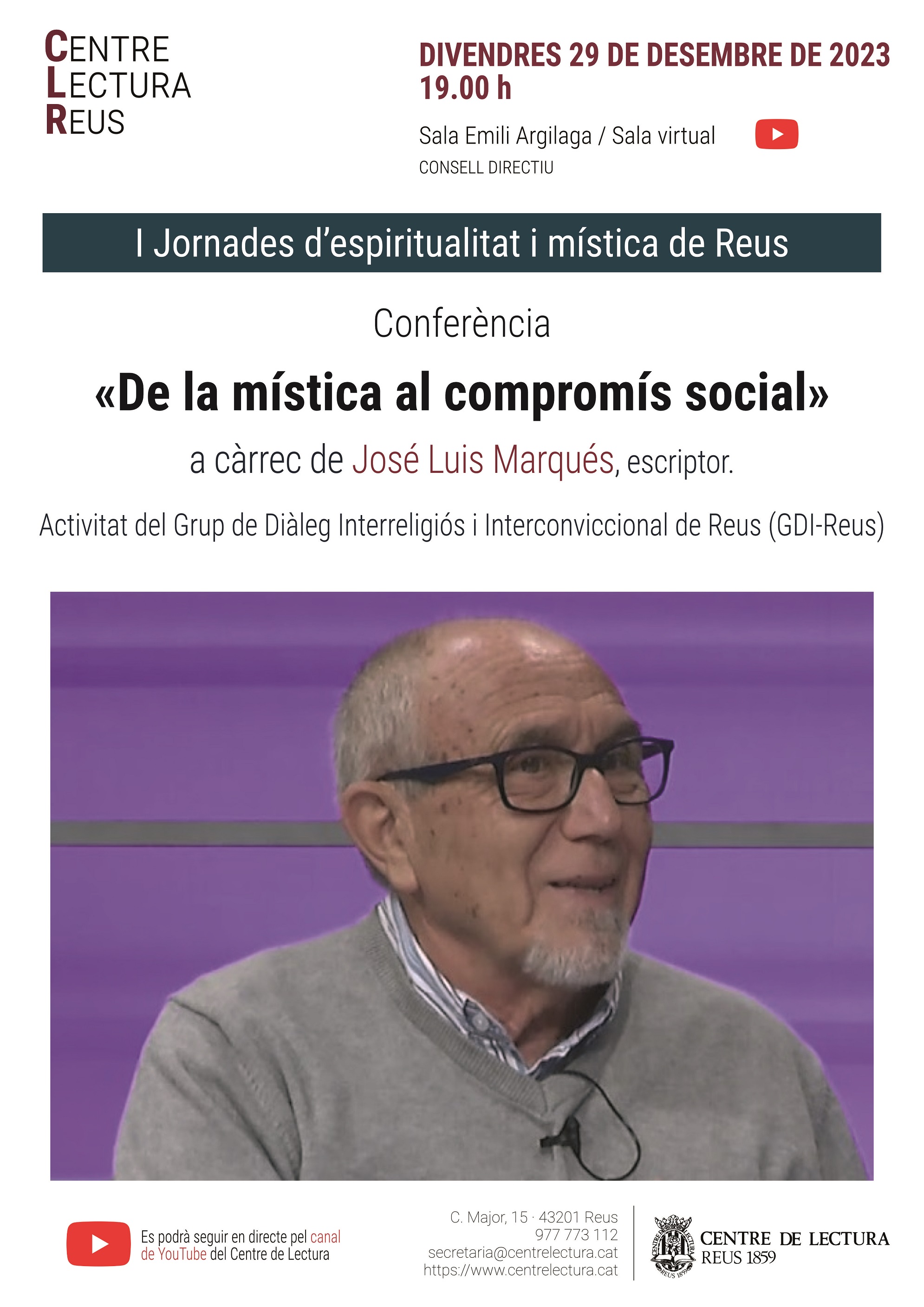 Divendres 29 de desembre, a les 19.00, a la sala Emili Argilaga, I Jornades d’espiritualitat i mística de Reus: conferència «De la mística al compromís social», a càrrec de José Luis Marqués, escriptor. Activitat del Grup de Diàleg Interreligiósi Interconviccional de Reus (GDI-Reus).