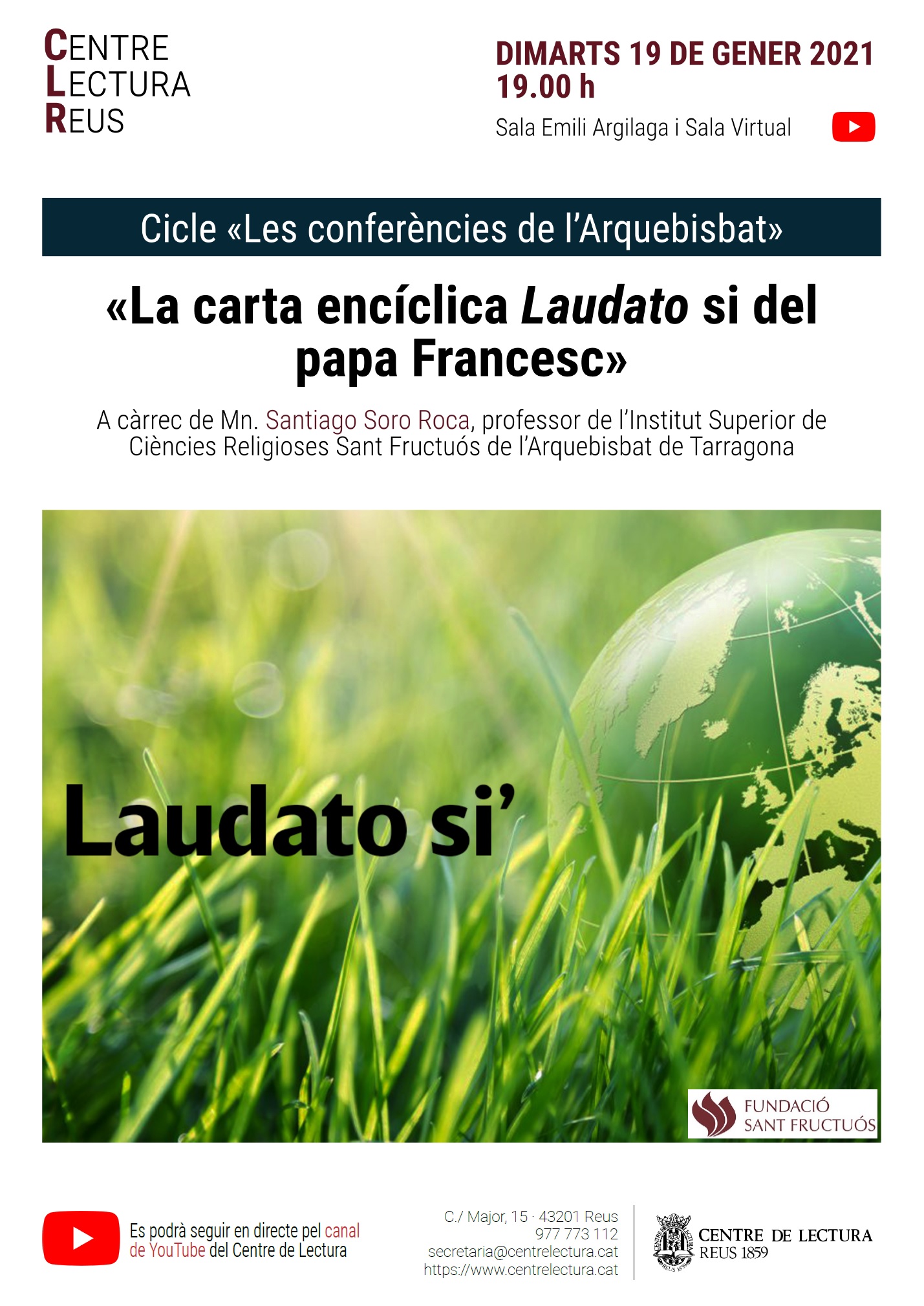 Dimarts 19 de gener, a les 19.00, a les sales Emili Argilaga i virtual, cicle «Les conferències de l’Arquebisbat»: conferència «La carta encíclica Laudato si del papa Francesc», a càrrec de Mn. Santiago Soro Roca, professor de l’Institut Superior de Ciències Religioses Sant Fructuós de l’Arquebisbat de Tarragona.