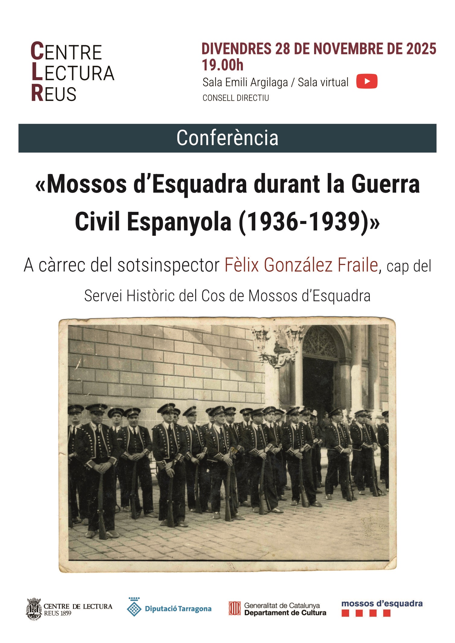 Divendres 28 de novembre, a les 19.00, a les sales Emili Argilaga i virtual, conferència «Mossos d’Esquadra durant la Guerra Civil Espanyola (1936-1939)», a càrrec de Fèlix González Fraile, cap del servei històric dels Mossos d’Esquadra.