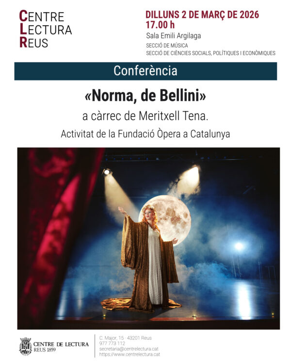 Dilluns 2 de març, a les 17.00, a la sala Emili Argilaga, conferència «Norma, de Bellini», a càrrec de Meritxell Tena, crítica i divulgadora cultural. Activitat de la Fundació Òpera Catalunya.