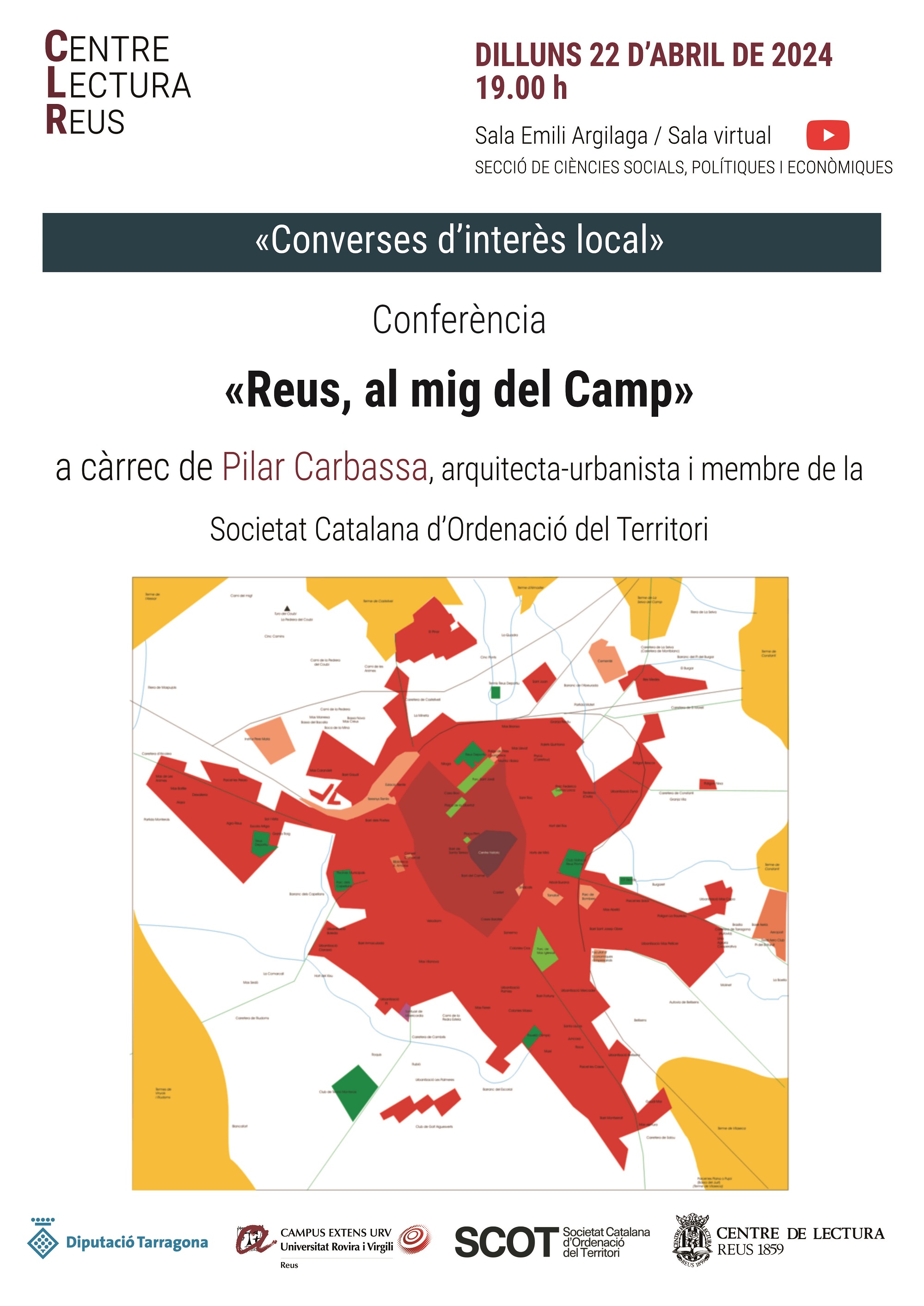 Dilluns 22 d’abril, a les 19.00, a les sales Emili Argilaga i virtual, «Converses d’interès local»: conferència «Reus, al mig del Camp», a càrrec de Pilar Carbassa, arquitecta-urbanista membre de la Societat Catalana d’Ordenació del Territori. Activitat del Campus Extens de la URV a Reus.