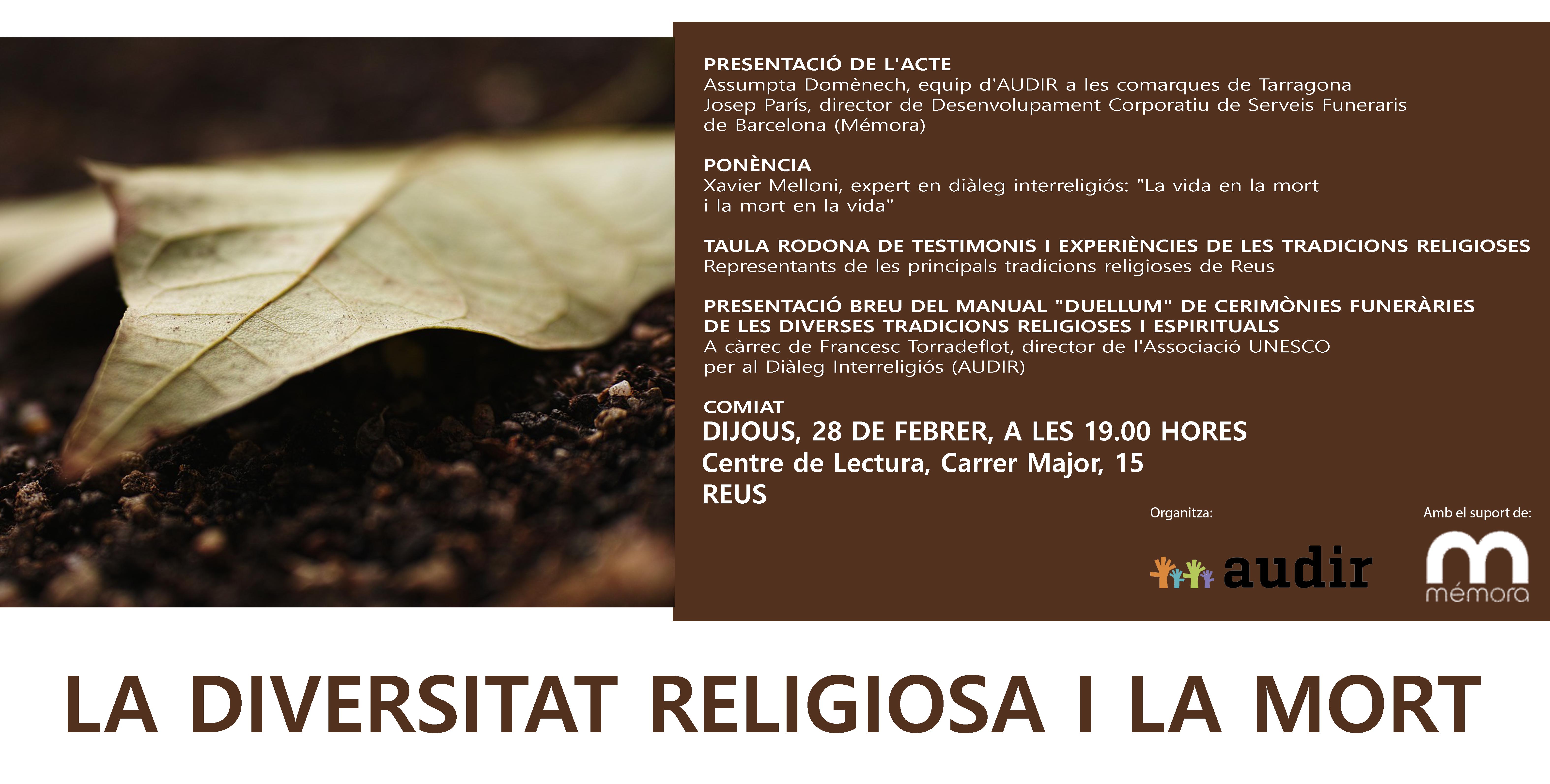 Dijous 28 de febrer, a les 19.00 h, a la sala Emili Argilaga, acte «La diversitat religiosa i la mort», de l’Associació Unesco per al Diàleg Interreligiós (AUDIR) i la Fundació Mémora. Presentaran l’acte Assumpta Domènech, de l’equip d’AUDIR a les comarques de Tarragona; i Josep París, director de Desenvolupament Corporatiu de Serveis Funeraris de Barcelona (Mémora).