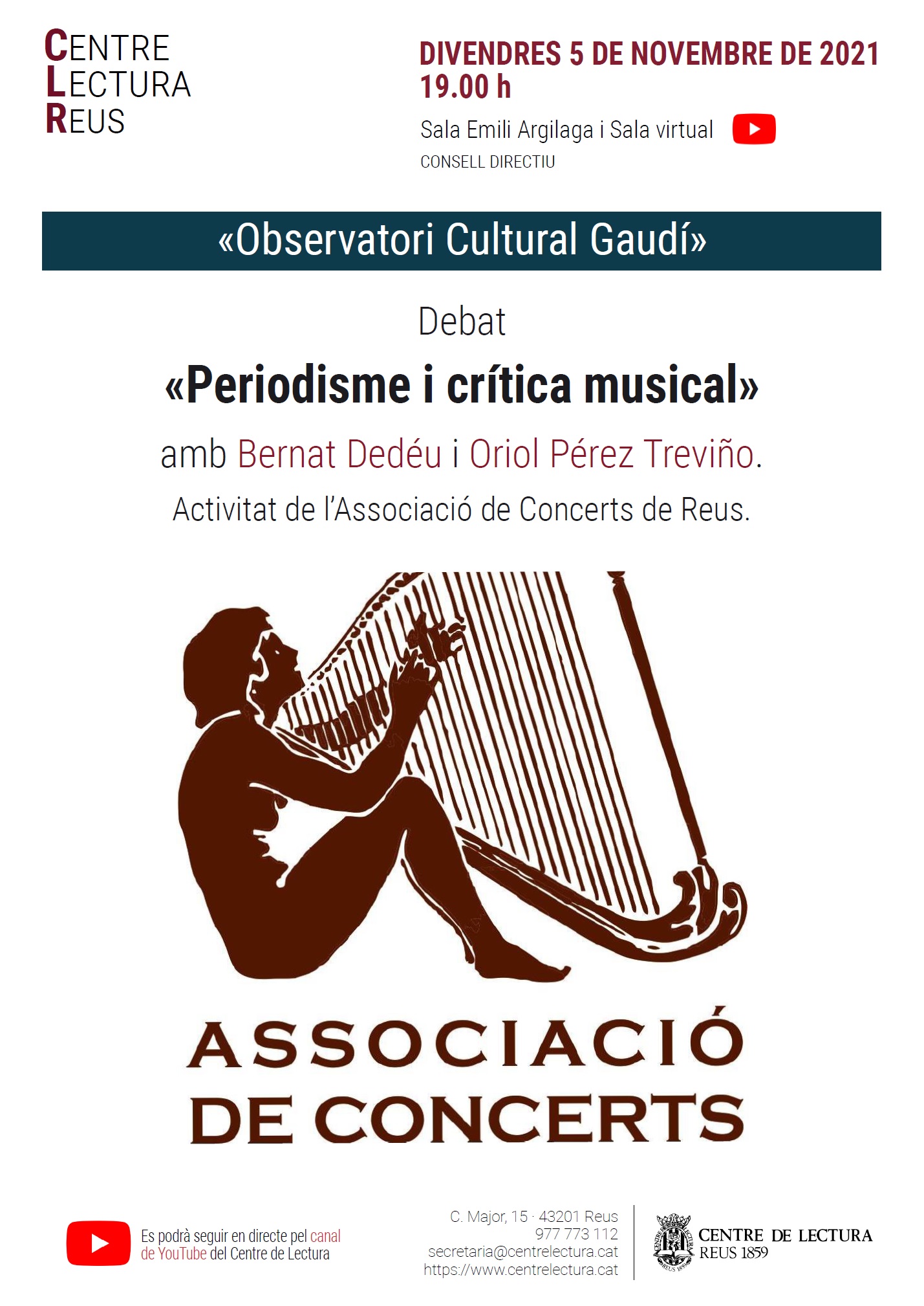 Divendres 5 de novembre, a les 19.00, a les sales Emili Argilaga i virtual, debat «Periodisme i crítica musical», amb Bernat Dedéu i Oriol Pérez Treviño. Activitat de l’Associació de Concerts de Reus.