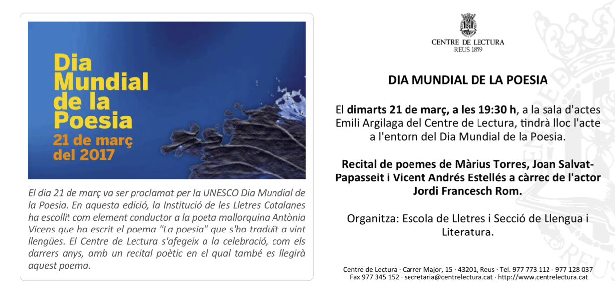 En aquesta edició del Dia Mundial, proclamat per la Unesco, la Institució de les Lletres Catalanes ha escollit com element central a la poeta mallorquina Antònia Vicens que ha escrit el poema “La poesia” i que s’ha traduït a vint llengües. El Centre de Lectura s’afegeix novament a la celebració del Dia Mundial amb un recital poètic en el qual també es llegirà aquest poema.