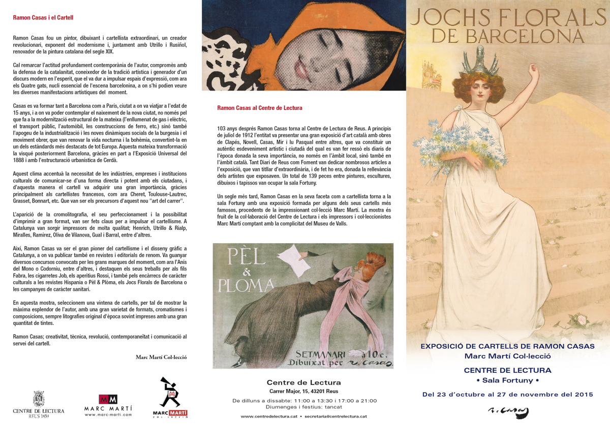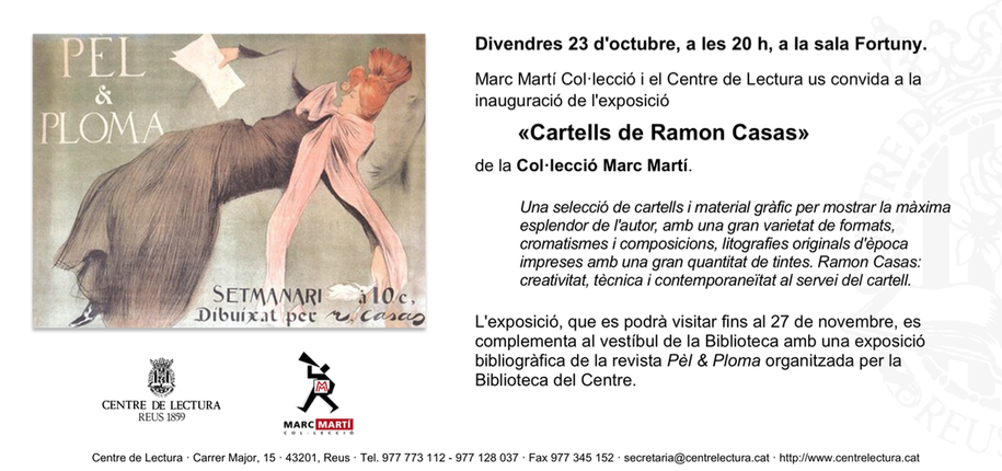Inauguració de l’exposició «Cartells de Ramon Casas» de la Col·lecció Marc Martí. Una selecció de cartells i material gràfic per mostrar la màxima esplendor de l’autor, amb una gran varietat de formats, cromatismes i composicions, litografies originals d’època impreses amb una gran quantitat de tintes. Ramon Casas: creativitat, tècnica i contemporaneïtat al servei del cartell.