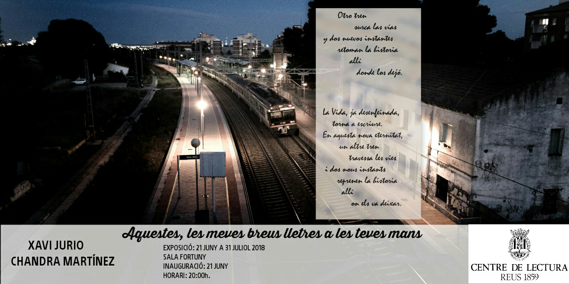 Dijous 21 de juny, a les 20.00 h, a la sala Fortuny, inauguració de l’exposició de fotografia narrativa «Aquestes, les meves breus lletres a les teves mans», de Xavi Jurio i Xandra Martínez. La mostra ofereix deu fotografies realitzades per Xavi Jurio i que es fonamenten en el poema de Martínez.