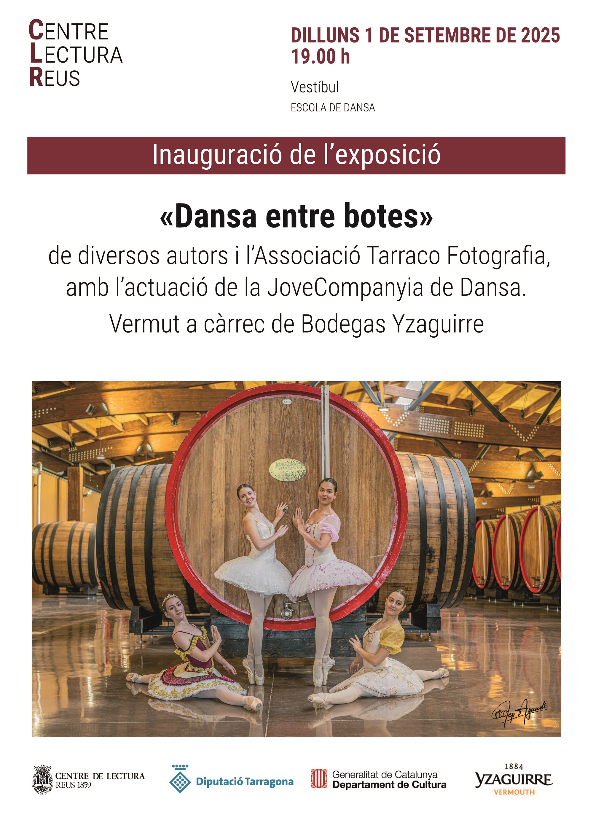 Dilluns 1 de setembre, a les 19.00, al vestíbul del Centre de Lectura, inauguració de l’exposició fotogràfica «Dansa entre botes» de diversos autors i l’Associació Tarraco Fotografia. Amb l’actuació de la Jove Companyia de Dansa. Fins al 15 de setembre.