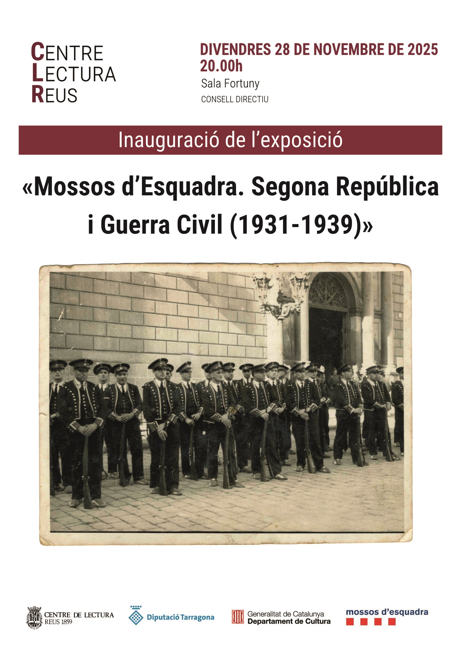 Divendres 28 de novembre, a les 20.00, a la sala Fortuny, inauguració de l’exposició «Mossos d’Esquadra. Segona República i Guerra Civil (1931-1939)». Fins al 8 de gener de 2026.