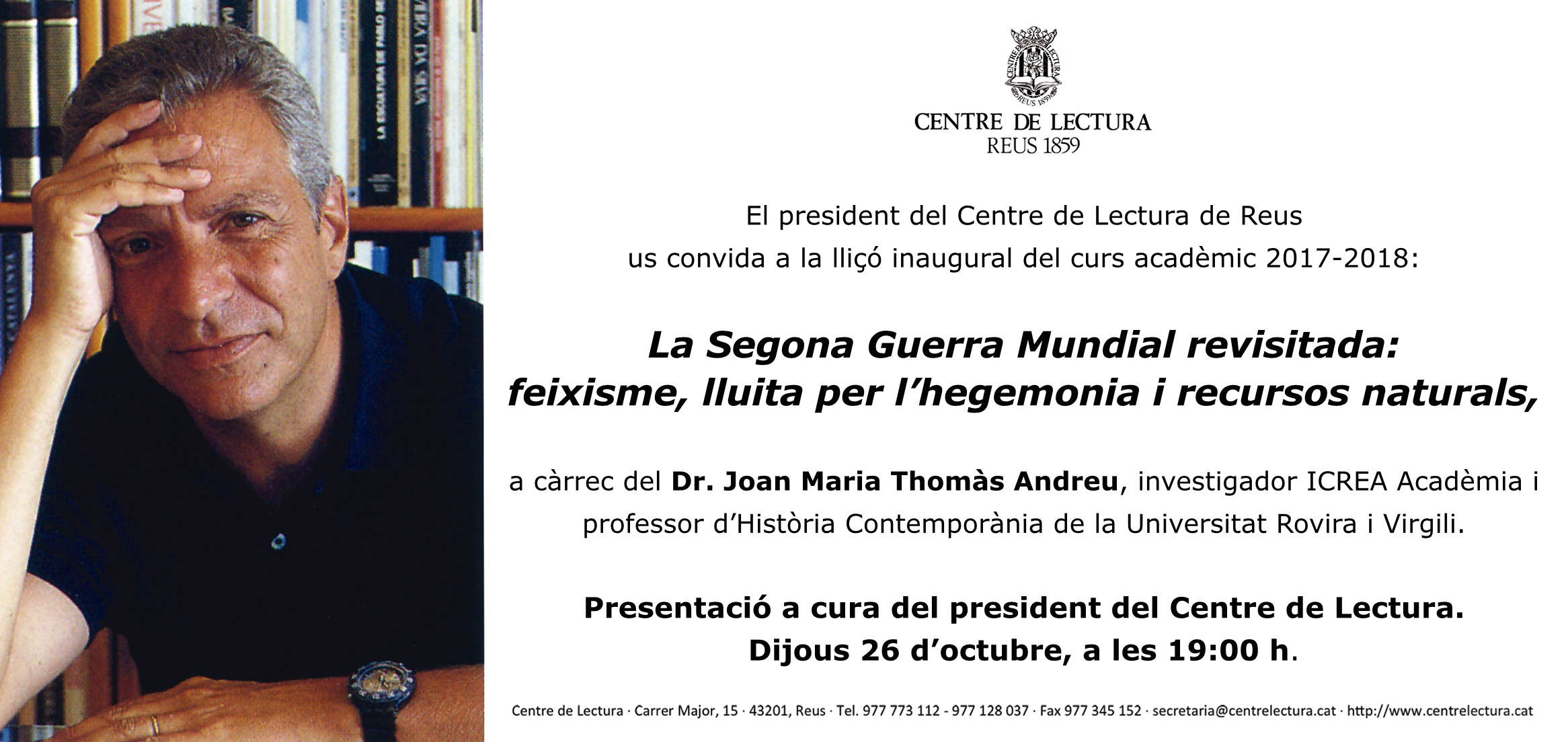 Dijous 26 d’octubre, a les 19.00 h, a la sala d’actes Emili Argilaga, lliçó inaugural del curs acadèmic 2017-2018 del Centre de Lectura: conferència «La Segona Guerra Mundial revisitada: feixisme, lluita per l’hegemonia i recursos naturals», a càrrec del Dr. Joan Maria Thomàs Andreu, investigador ICREA Acadèmia i professor d’Història Contemporània de la Universitat Rovira i Virgili. Presentació a càrrec de Jaume Massó, president del Centre de Lectura.
