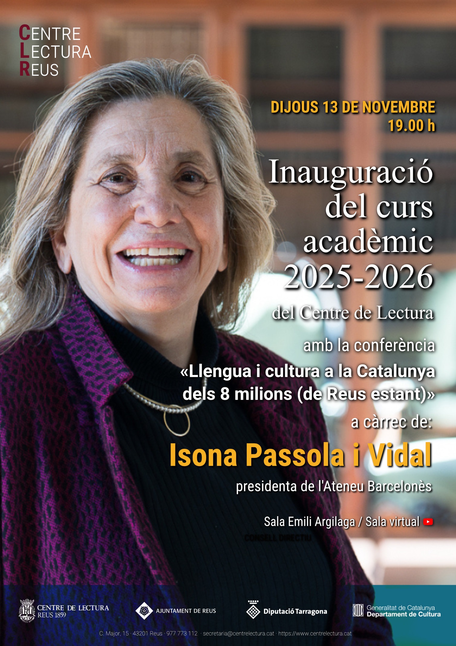 Dijous 13 de novembre, a les 19.o0, a les sales Emili Argilaga i virtual, inauguració del curs acadèmic 2025-2026 del Centre de Lectura amb la conferència «Llengua i cultura a la Catalunya dels 8 milions (de Reus estant), a càrrec d’Isona Passola, presidenta de l’Ateneu Barcelonès.