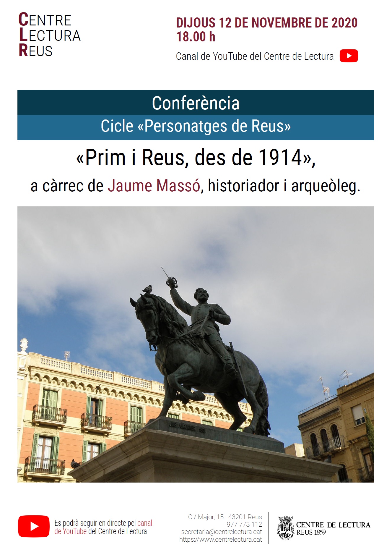 Dijous 12 de novembre, a les 18.00, a la sala virtual del Centre de Lectura, conferència «Prim i Reus, des de 1914», a càrrec de Jaume Massó, historiador i arqueòleg. Activitat del cicle «Personatges de Reus».