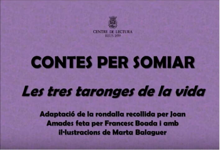 Segona sessió del cicle «Contes per somiar», que el Centre de Lectura organitza per als infants ingressats a l’Hospital de Sant Joan de Reus. A partir l’adaptació de la rondalla recollida per Joan Amades feta per Francesc Boada i amb il·lustracions de Marta Balaguer, us presentem «Les tres taronges de la vida». Lectura i muntatge a càrrec de Marta Vidal. En col·laboració amb l’Hospital Sant Joan de Reus. Amb el suport de la Institució de les Lletres Catalanes, Fundació «la Caixa» i Òptiques Teixidó.