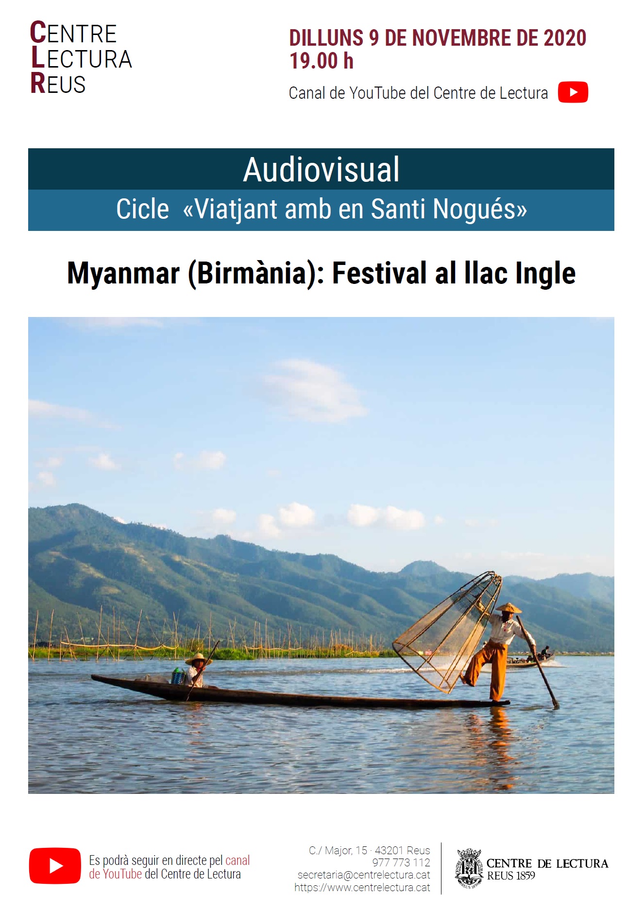 Dilluns 9 de novembre, a les 19.00, a la sala virtual del Centre de Lectura, projecció de l’audiovisual Myanmar (Birmània): festival al llac Ingle. L’activitat forma part del cicle «Viatjant amb en Santi Nogués».