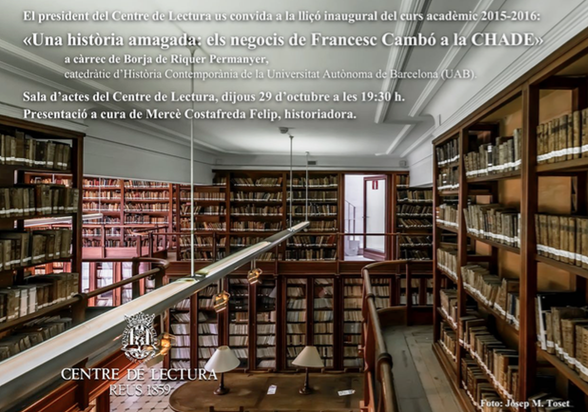 Lliçó inaugural del curs acadèmic 2015-2016: «Una història amagada: els negocis de Francesc Cambó a la CHADE», a càrrec de Borja de Riquer Permanyer, catedràtic d’Història Contemporània de la Universitat Autònoma de Barcelona (UAB).