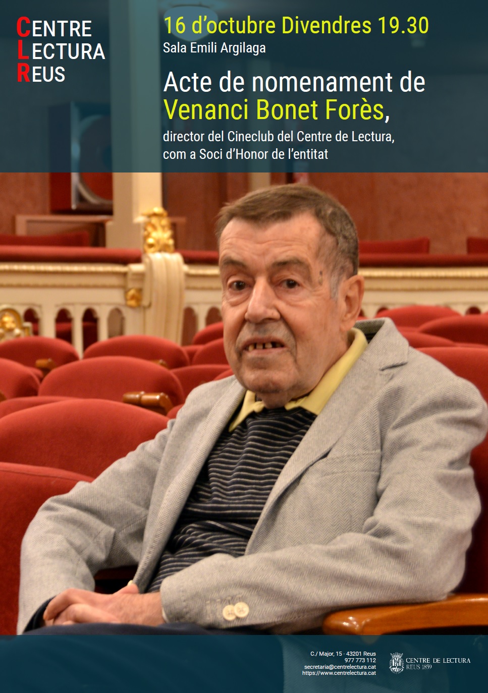 Divendres 16 d’octubre, a les 19.30, a la sala Emili Argilaga, acte de nomenament de Venanci Bonet Forès, director del Cineclub del Centre de Lectura, com a Soci d’Honor de l’entitat.