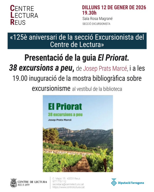 Dilluns 12 de gener, a les 19.30, a la sala Rosa Magrané, «125è aniversari de la secció Excursionista del Centre de Lectura»: presentació de la guia El Priorat. 38 excursions a peu, de Josep Prats Marcé. I a les 19.00, inauguració de la mostra bibliogràfica sobre excursionisme al vestíbul de la biblioteca.