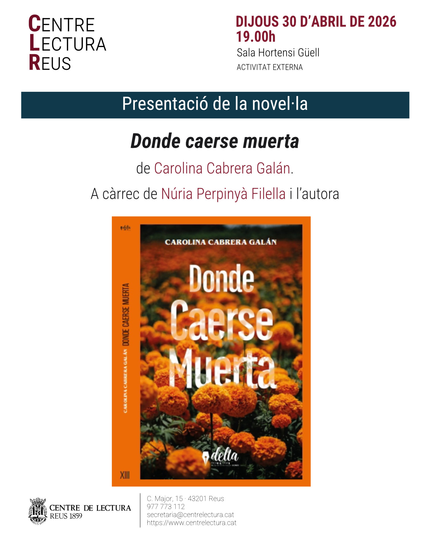 Dijous 30 d’abril, a les 19.00, a la sala Hortensi Güell, presentació de la novel·la Donde caerse muerta, de Carolina Cabrera Galán. XIII Premi Literari Delta de Narrativa per a …llegir més