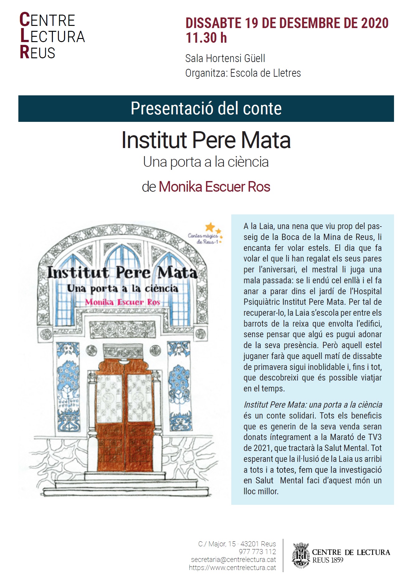 Dissabte 19 de desembre a les 11.30, a la sala Hortensi Güell, presentació del conte Institut Pere Mata. Una porta a la ciència, de Mònika Escuer.