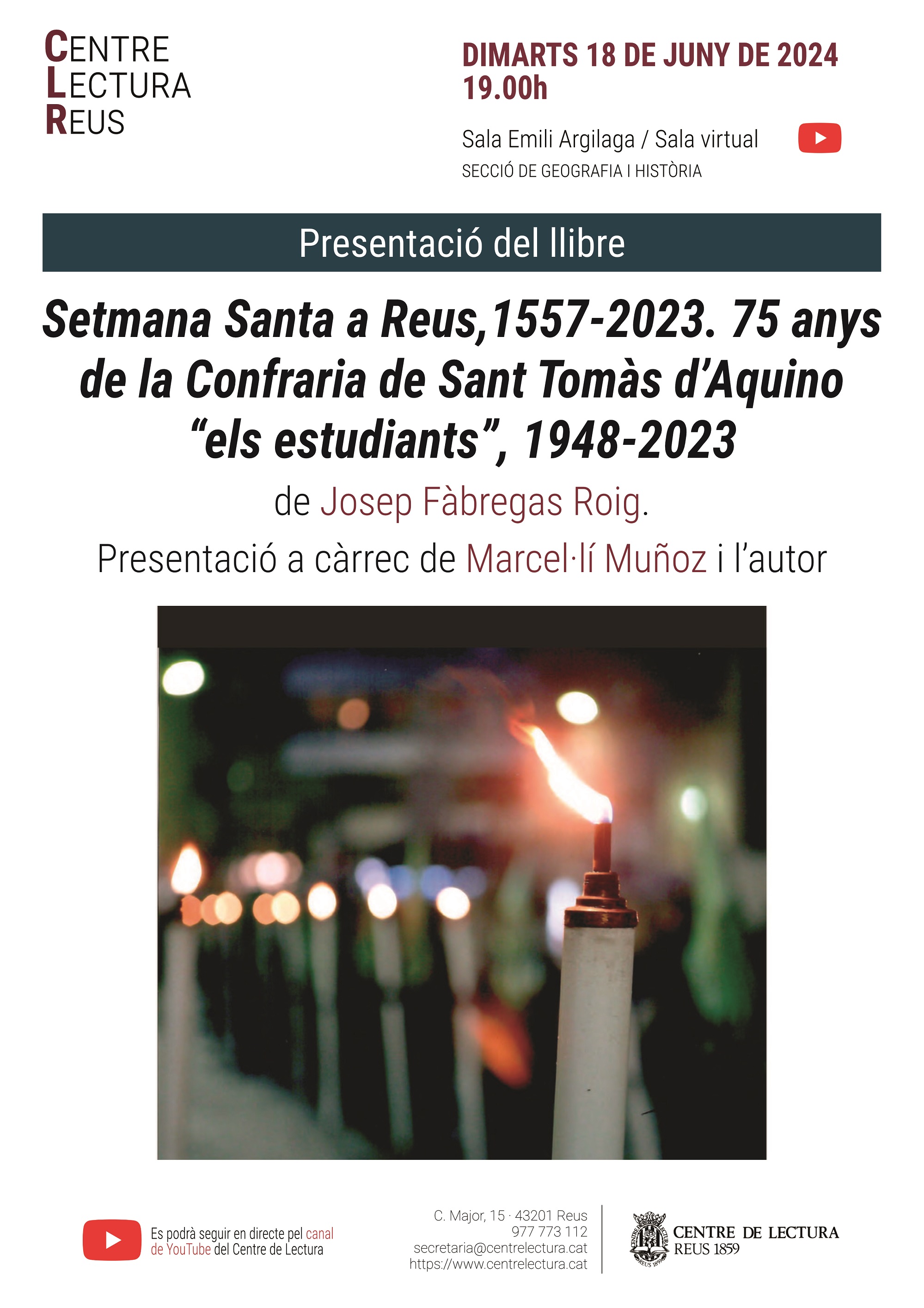 Dimarts 18 de juny, a les 19.00, a les sales Emili Argilaga i virtual, presentació del llibre 75 anys de la Confraria de Sant Tomàs d’Aquino “els estudiants”, 1948-2023, de Josep Fàbregas Roig. Presentació a càrrec de Marcel·lí Muñoz, pare de la Congregació de Fills de la Sagrada Família, i l’autor.