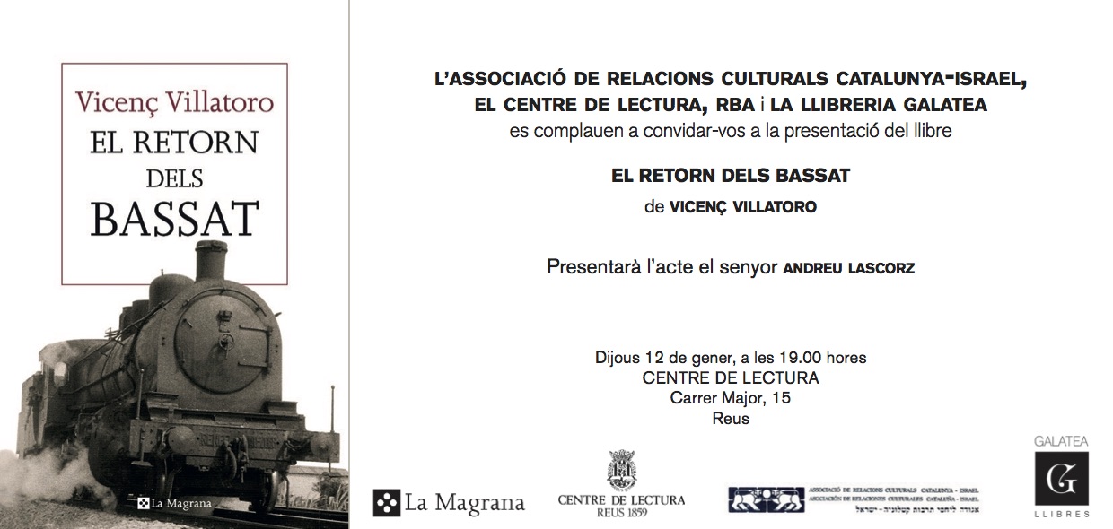 Dijous 12 de gener a les 19:00 h a la sala d’actes Emili Argilaga, presentació del llibre El retorn dels Bassat de Vicenç Villatoro. Presentació a càrrec d’Andreu Lascorz.