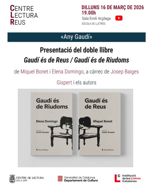 Dilluns 16 de març, a les 19.00, a les sales Emili Argilaga i virtual, presentació del llibre Gaudí és de Riudoms, Gaudí és de Reus, d’Elena Domingo i Miquel Bonet, a càrrec de Josep Baiges Gispert.