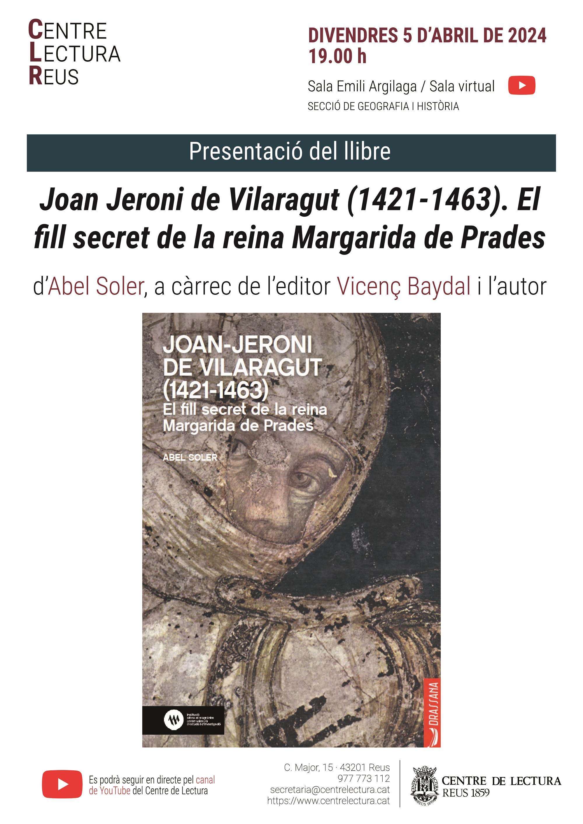 Divendres 5 d’abril, a les 19.00, a les sales Emili Argilaga i virtual, presentació del llibre Joan Jeroni de Vilaragut (1421-1463). El fill secret de la reina Margarida de Prades, d’Abel Soler, a càrrec de l’editor Vicenç Baydal i l’autor.