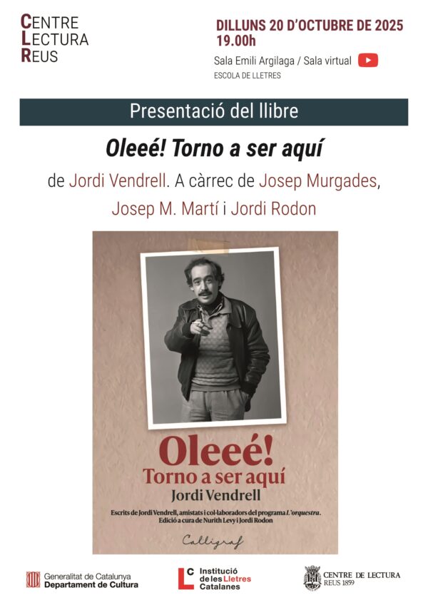 Dilluns 20 d’octubre, a les 19.00, a les sales Emili Argilaga i virtual, presentació del llibre Oleeé! Torno a ser aquí, de Jordi Vendrell. A càrrec de Josep Murgades, Josep M. Martí i Jordi Rodon.