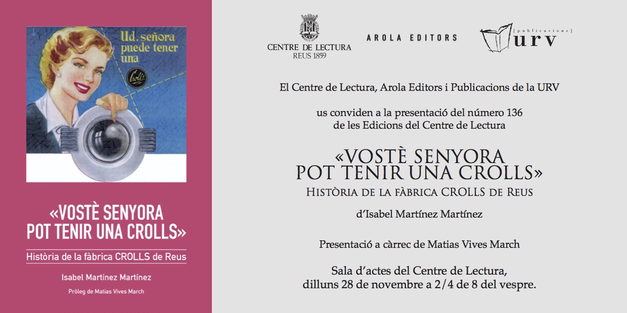Presentació del número 136 de les Edicions del Centre de Lectura «Vostè senyora pot tenir una Crolls». Història de la fàbrica Crolls de Reus d’Isabel Martínez Martínez. Presentació a càrrec de Matias Vives March.