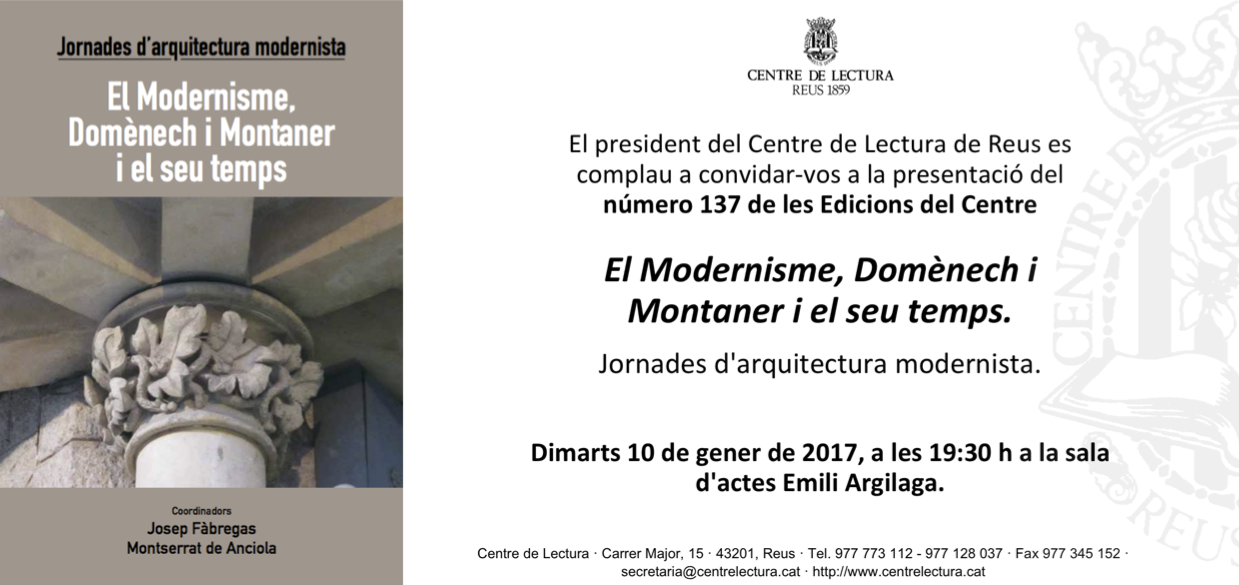 Dimarts 10 de gener de 2017, a les 19:30 h a la sala d’actes del Centre de Lectura, presentació del volum número 137 de les Edicions del Centre de Lectura El Modernisme, Domènech i Montaner i el seu temps, que recull les ponències de les Jornades d’arquitectura modernista organitzades al Centre de Lectura del 8 al 17 de març de 2016.