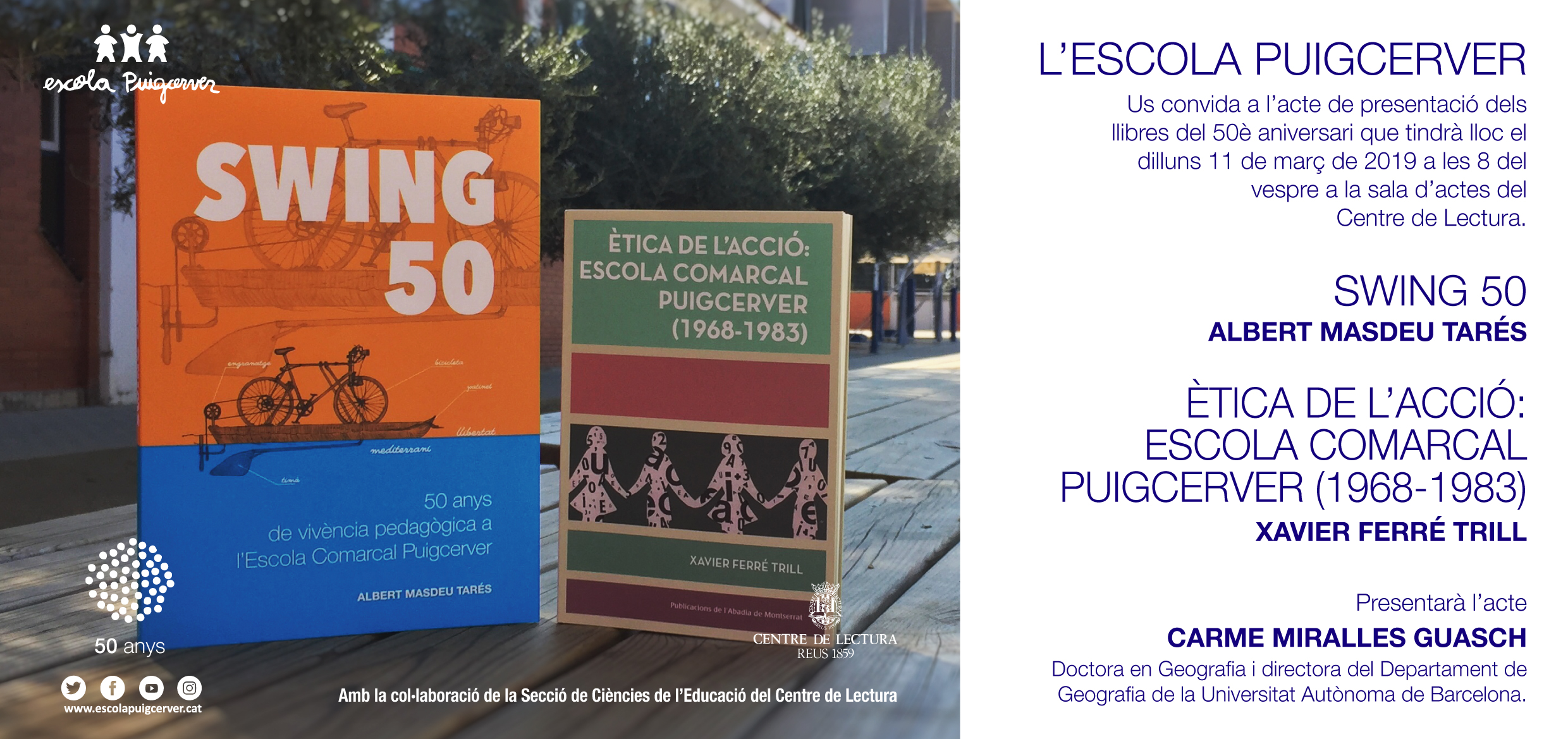 Dilluns 11 de març, a les 20.00 h, a la sala Emili Argilaga, presentació dels llibres del 50è aniversari de l’Escola Puigcerver: Ètica de l’acció: Escola Comarcal Puigcerver (1968-1983), de Xavier Ferré Trill; i Swing 50, d’Albert Masdeu Tarés. Presentarà l’acte Carme Miralles Guasch, doctora en Geografia i directora del Departament de Geografia de la Universitat Autònoma de Barcelona.