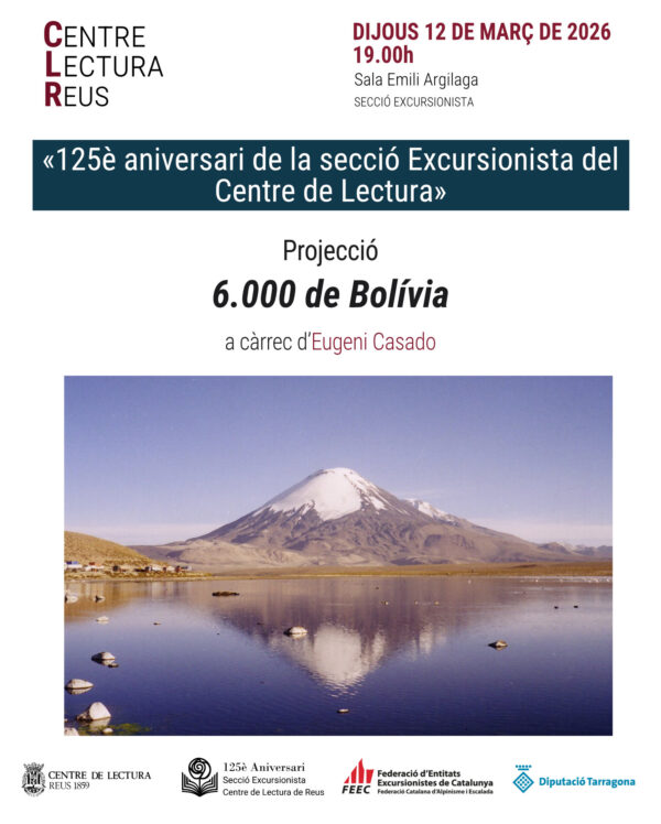 Dijous 12 de març, a les 19.00, a la sala Rosa Magrané, «125è aniversari de la secció Excursionista del Centre de Lectura»: projecció 6.000 de Bolívia, a càrrec d’Eugeni Casado.