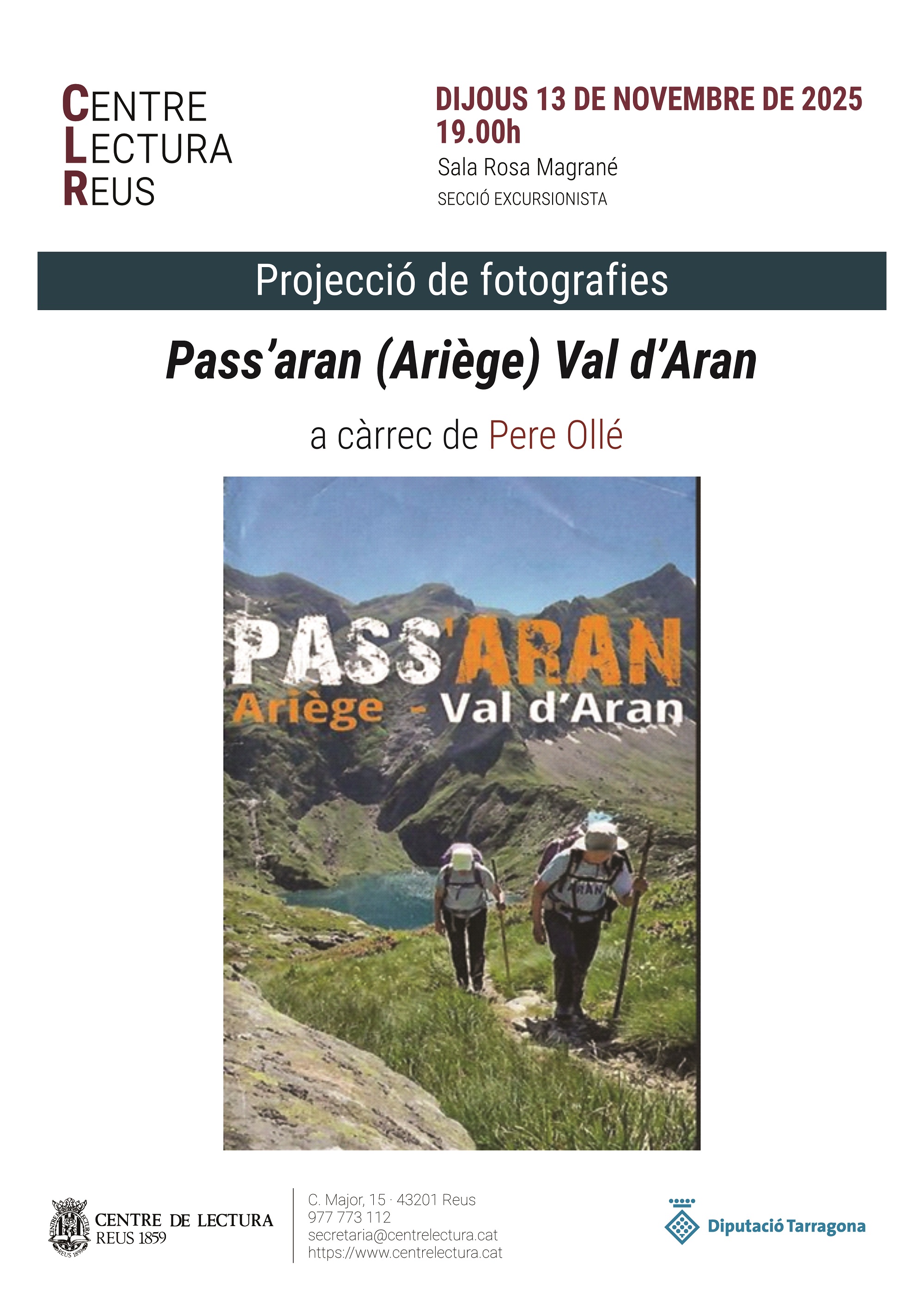 Dijous 13 de novembre, a les 19.00, a la sala Rosa Magrané, projecció de fotografies Pass’aran (Ariège) Val d’Aran, a càrrec de Pere Ollé.