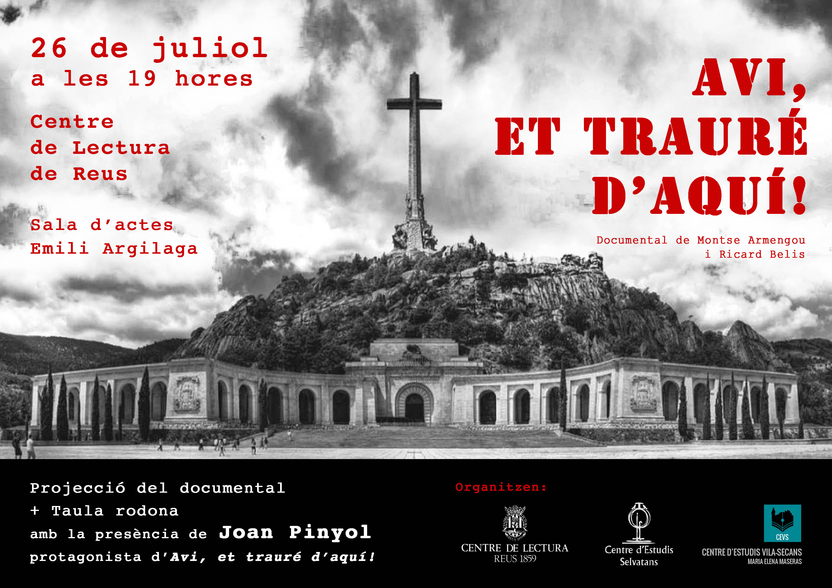 rojecció del documental Avi, et trauré d’aquí (2013, Montse Armengou i Ricard Belis, TV3, 75 minuts). L’acte el presentarà Joaquim Besora, president de la Secció de Ciències Socials, Polítiques i Econòmiques, i comptarà amb la participació de Robert Casas Roigé, professor de estudis ibèrics a Hood College (Maryland, EUA), que va fer la seva tesi sobre documentals que revelen latències del franquisme en la democràcia actual. Després de la projecció, s’encetarà una taula rodona amb Joan Pinyol, escriptor i protagonista del document