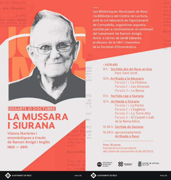 Les Biblioteques Municipals de Reus i la Biblioteca del Centre de Lectura, amb la col·laboració de l’Ajuntament de Cornudella, organitzem la sortida «La Mussara i Siurana. Visions literàries i onomàstiques a través de Ramon Amigó Anglès (1925-2011) per commemorar el centenari del naixement de l’onomasiòleg reusenc. La conduirà Jordi Cáceres, professor de la URV i membre de la Societat d’Onomàstica.