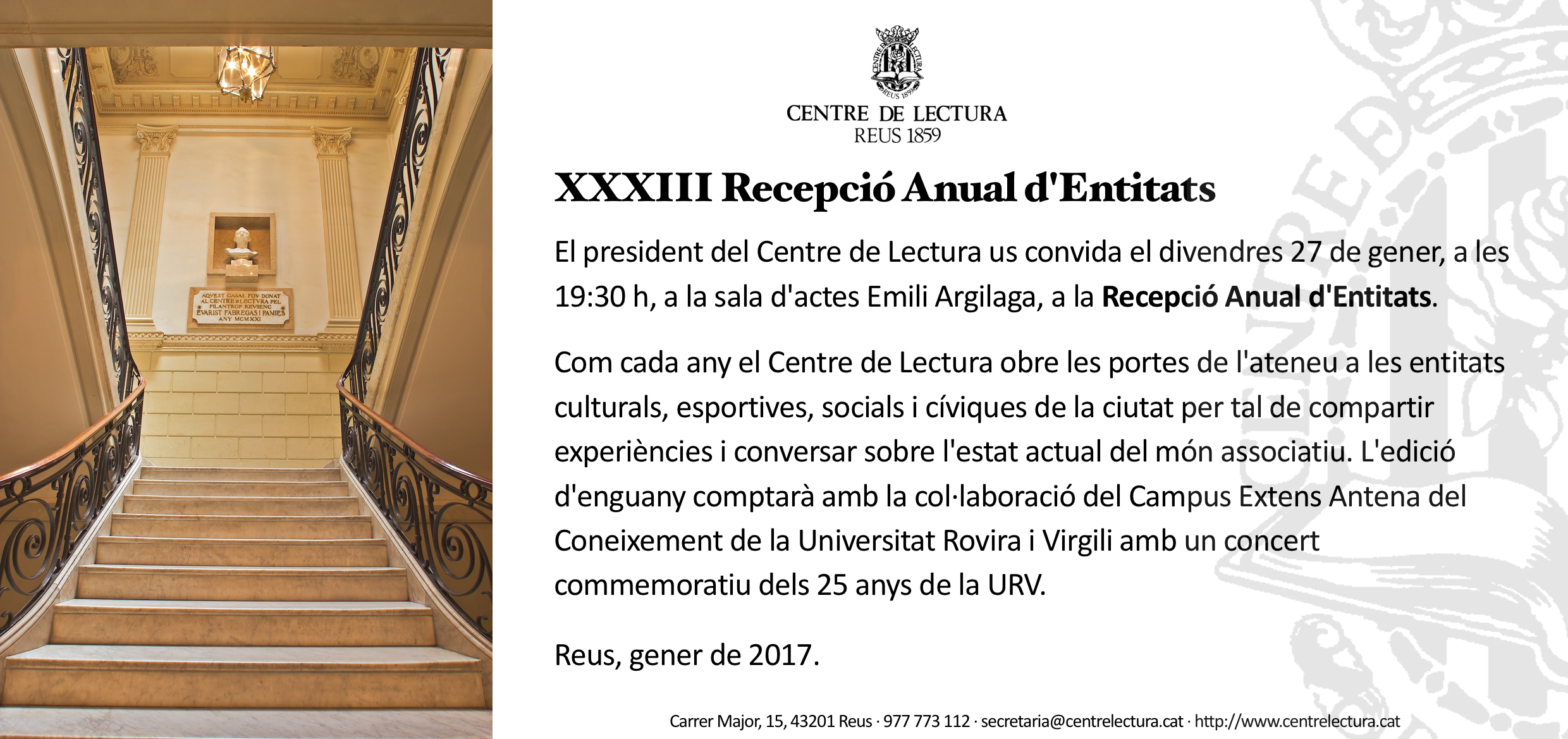 Com cada any el Centre de Lectura obre les portes de l’ateneu a les entitats culturals, esportives, socials i cíviques de la ciutat per tal de compartir experiències i conversar sobre l’estat actual del món associatiu. L’edició d’enguany comptarà amb la col·laboració del Campus Extens Antena del Coneixement de la Universitat Rovira i Virgili amb un concert commemoratiu dels 25 anys de la URV.