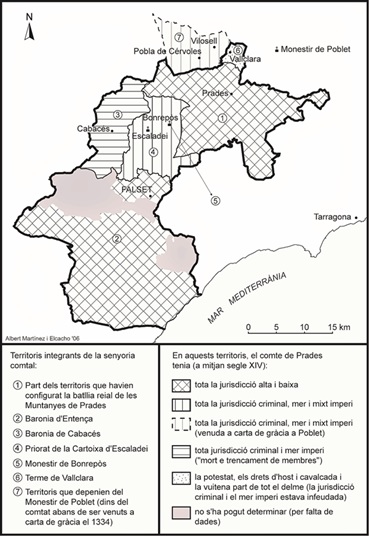 Amb la cessió del mer i mixt imperi, i de qualsevol altra jurisdicció, el rei de la Corona catalanoaragonesa delegava en el comte de les Muntanyes de Prades tot el poder polític i jurídic, sense ni tan sols reservar per a la Corona l’exclusivitat dels seus jutges en els plets per crims de sang, com feia de vegades la monarquia. El mer imperi constituïa el major grau de jurisdicció i comportava l’atribució per jutjar i castigar els crims públics que es punien amb la pena de mort, la mutilació de membres o el bandejament del lloc. El mixt imperi corresponia a la jurisdicció per a resoldre litigis civils o per jutjar infraccions de petita i mitjana importància que es castigaven normalment amb penes pecuniàries.