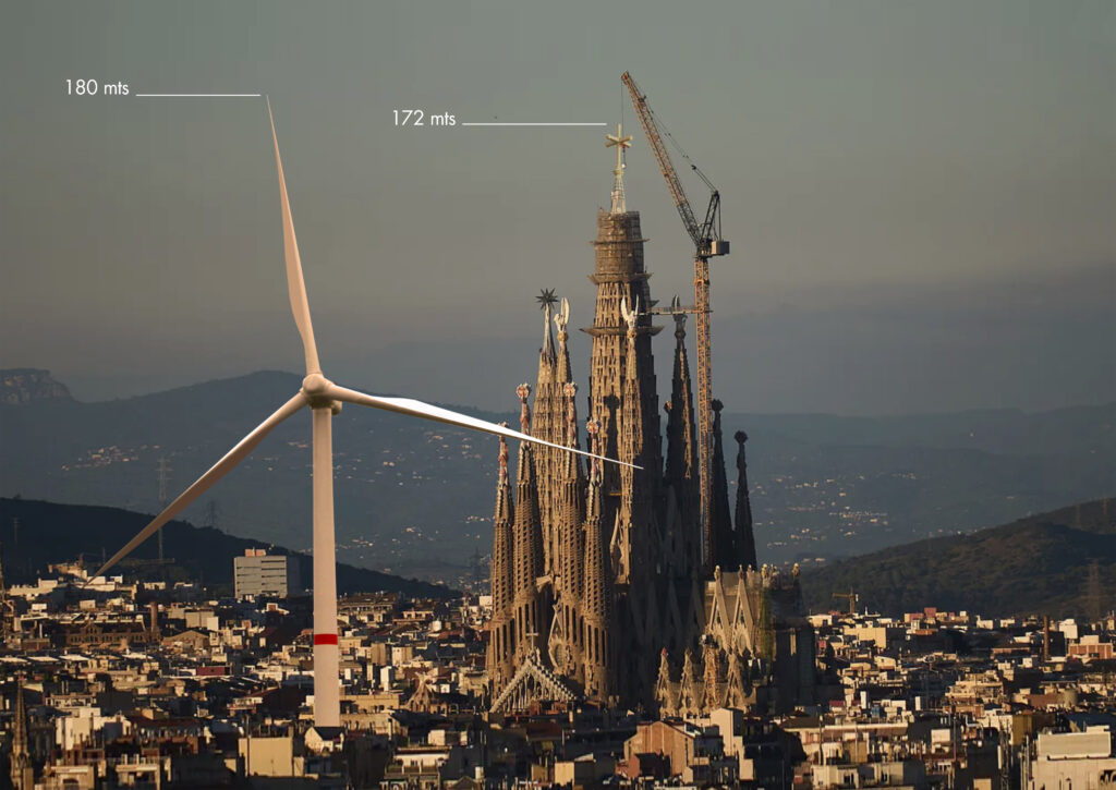 Imatge generada per intel·ligència artificial per a visualitzar que l’alçada de 180 metres dels aerogeneradors previstos als termes de Montbrió del Camp i Riudecanyes és similar a la de la Sagrada Família de Barcelona.